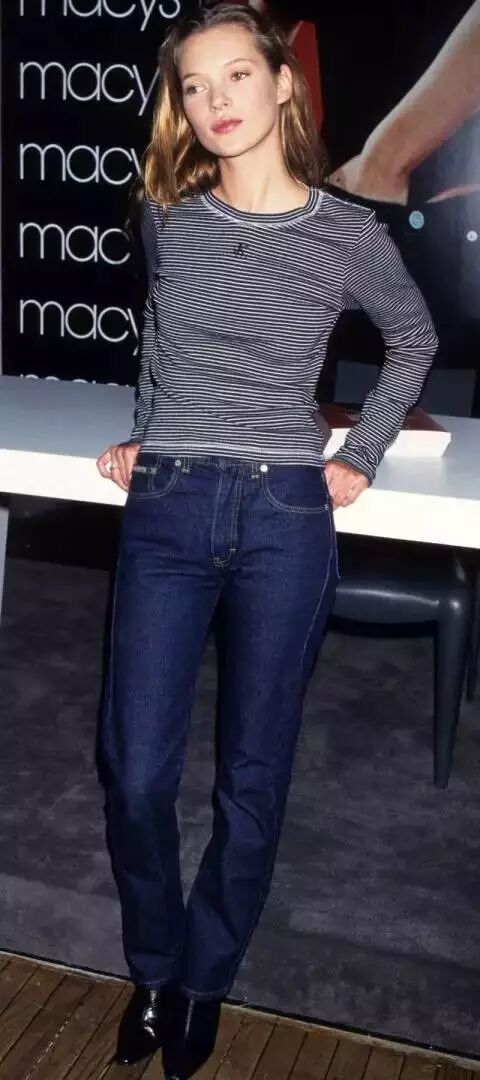Kate Moss在活動上為CK的牛仔褲做宣傳。這時候,牛仔褲的布料開始變得更有彈性,不再僵硬死板。