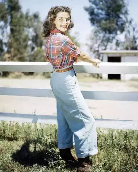 1934年,李維斯推出了世界上第一條女士牛仔褲,當時穿牛仔褲最多的還是在農(nóng)場和牧場里忙活的姑娘們。16年后,牛仔褲實用性不變,卻變得更加時尚起來。隨著好萊塢電影漸漸風靡全球,越來越多的電影和鏡頭里面都出現(xiàn)了牛仔褲的影子。這張照片上的Jane Russell就是一個很好的例子。